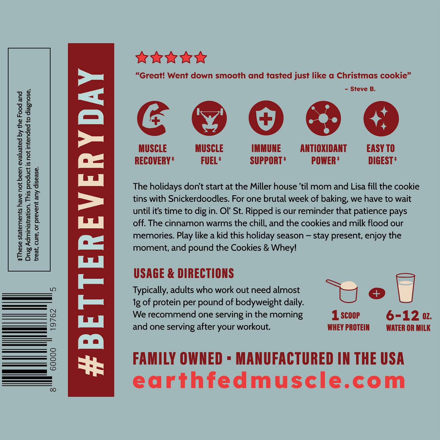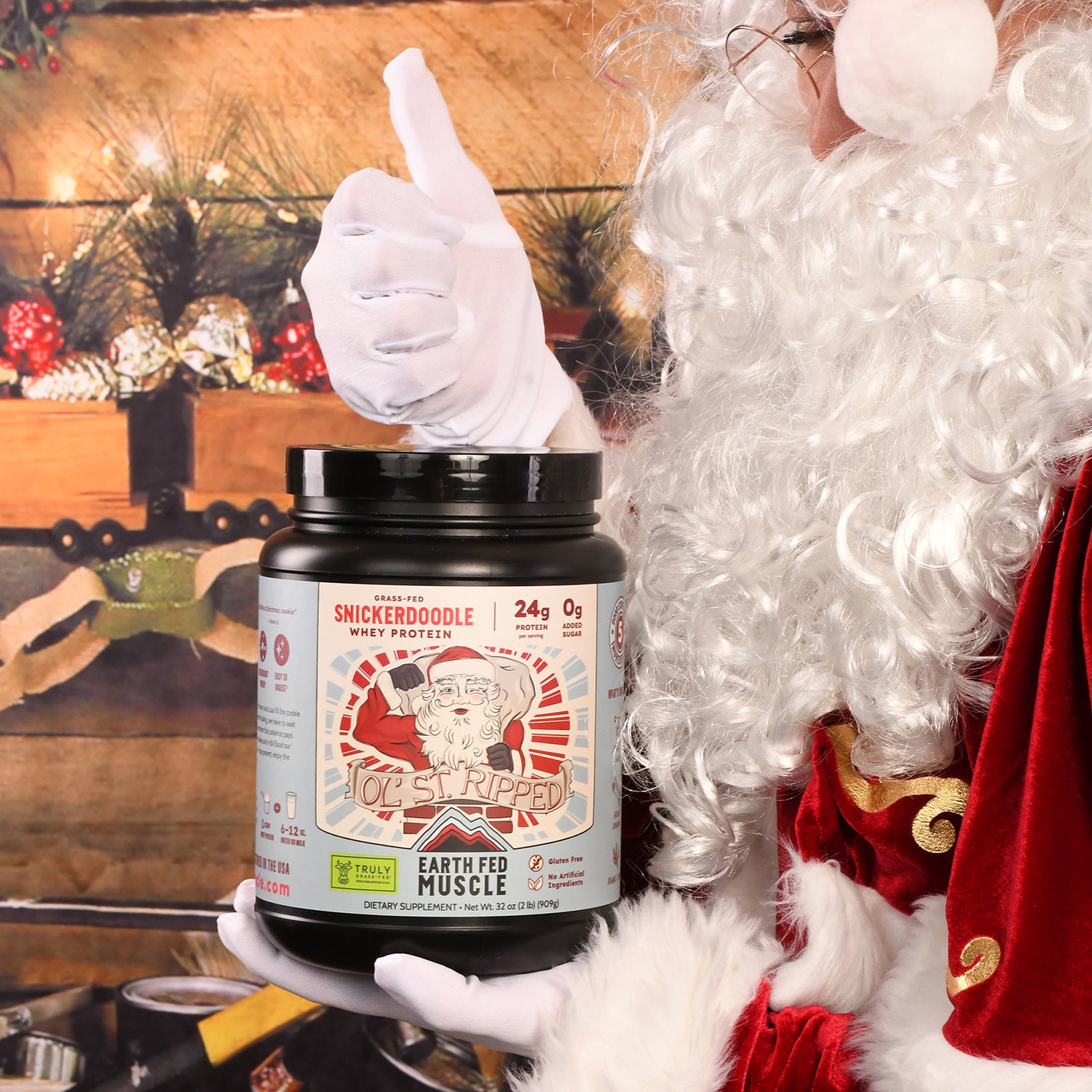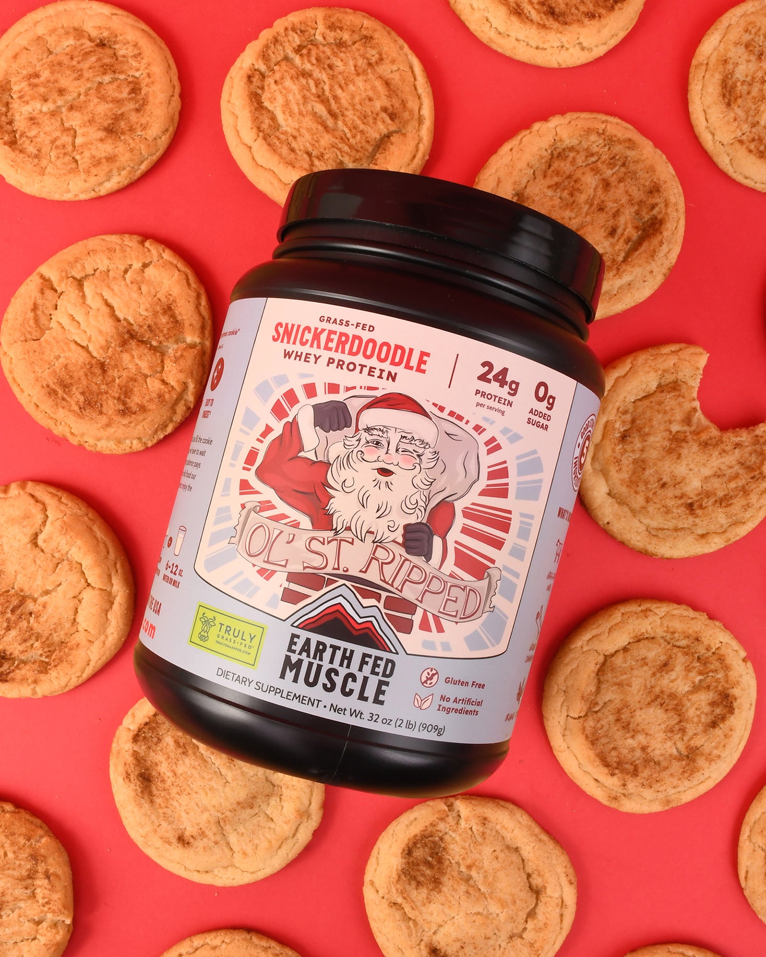 Continue shoppingThe Holidays officially start at the Miller house when mom and her friend Lisa bake about a thousand cookies in holiday tins. The hard part was that they weren’t to be opened until they were arranged neatly on a tray, and served with hot chocolate...a week later! That week was brutal - an education in patience, willpower, and finding out the stash. Ol’ St. Ripped is our reminder of that anticipation and pleasant surprise in the holiday tin - the Snickerdoodle cookie. The cinnamon warms the chill, the sweet cookies and milk finish floods our memories. Play like a kid this holiday season in whatever you find yourself - stay present, enjoy the moment, and pound the cookies and whey!