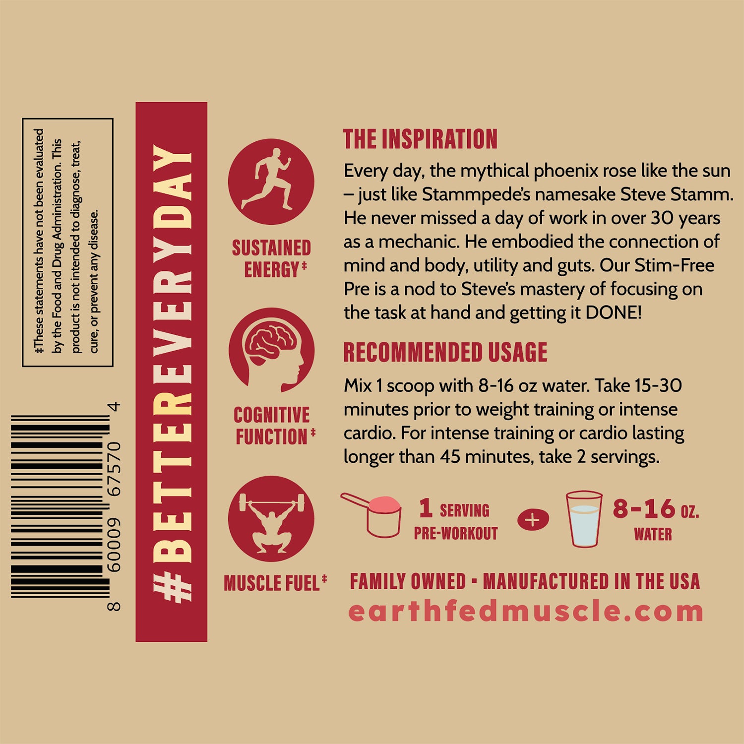 Continue shoppingEveryday the mythical phoenix rose like the sun – just like Stammpede’s namesake Steve Stamm. He never missed a day of work in over 30 years as a mechanic. He embodied the connection of mind and body, utility and guts. Our Stim-Free Stammpede is a nod to Steve’s spirit to bring it all together, focus on the task at hand and get it DONE!